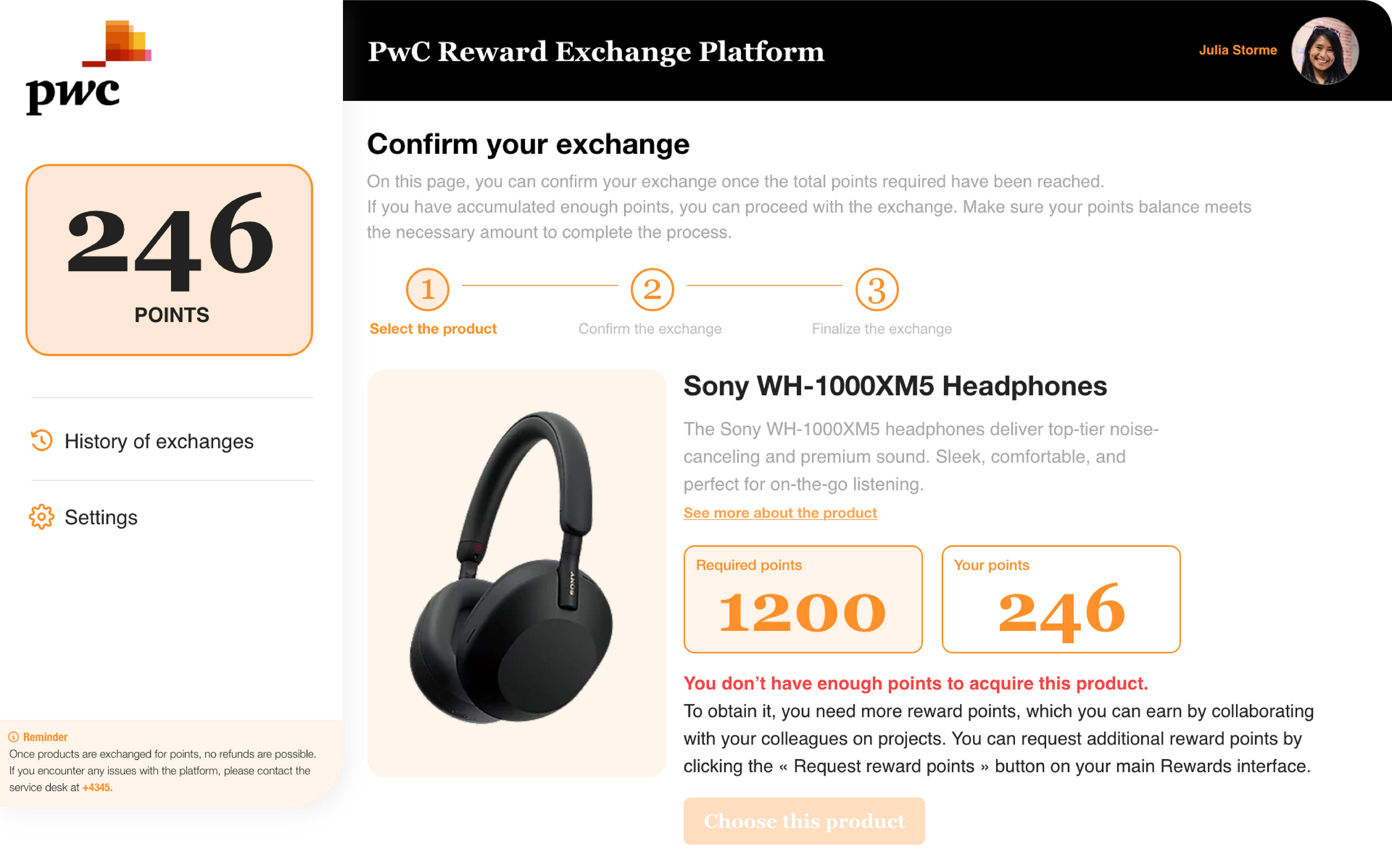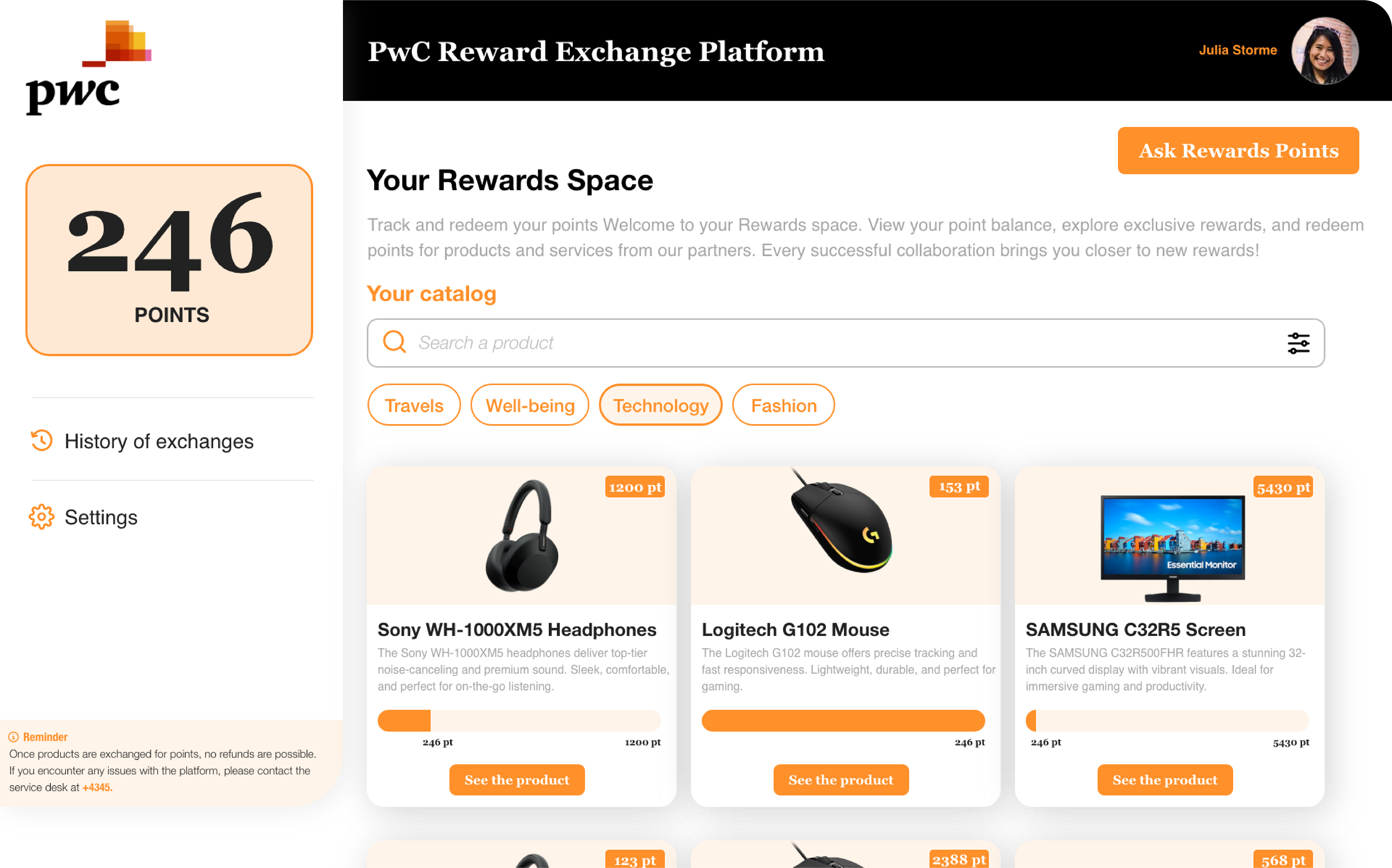 PwC, a consulting and auditing firm, aims to boost internal collaboration by rewarding employees who actively participate in successful projects. The current system lacks visibility and accessibility, preventing employees from fully enjoying their rewards. Therefore, a dedicated platform is needed to facilitate the exchange of points for a wide range of products.